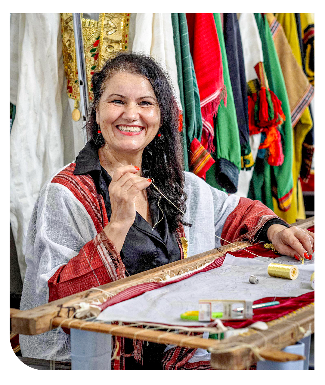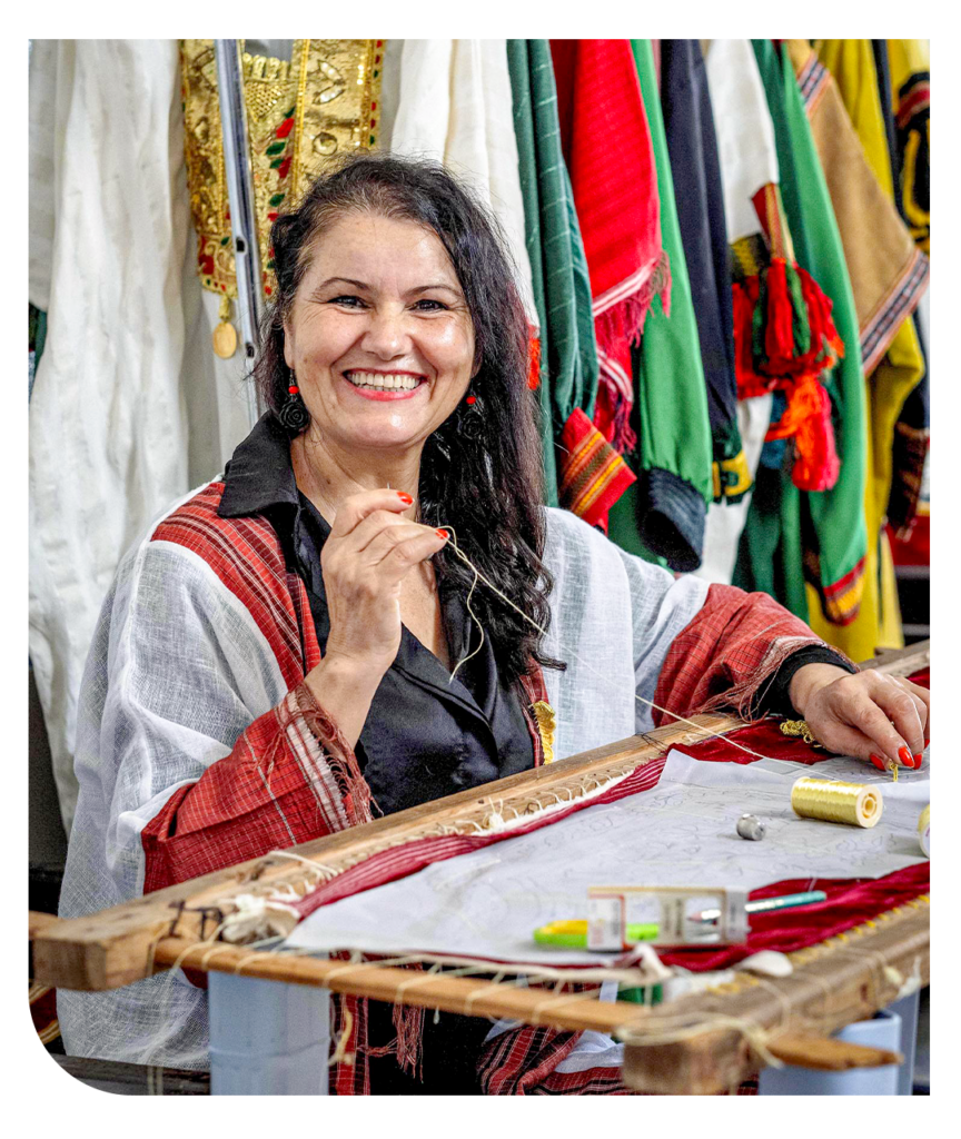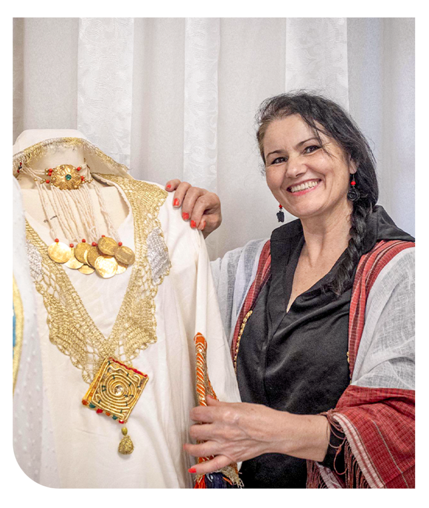 Ce geste, Lamia l’a fait sien, puis l’a enrichi de sa propre sensibilité. Depuis près de trente ans, la broderie est au centre de sa vie. Elle l’a accompagnée, façonnée et, en retour, lui a permis de s’épanouir pleinement. Car au-delà de l’artisanat, Lamia a su faire de sa passion un projet solide et durable. Aujourd’hui entrepreneure accomplie, elle incarne avec fierté cette alliance rare entre tradition et modernité.